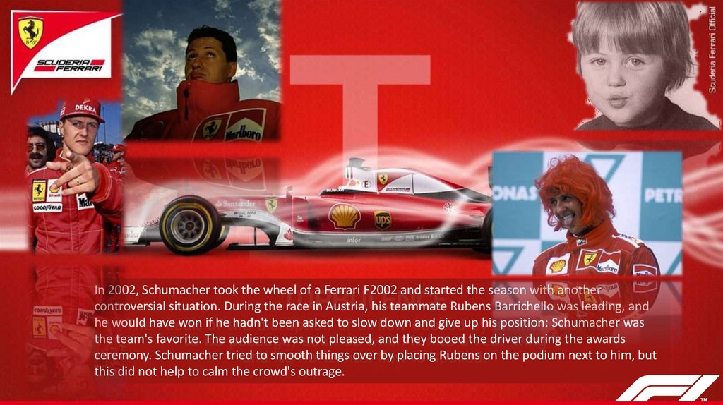 In 2002, Schumacher took the wheel of a Ferrari F2002 and started the season with anothercontroversial situation. During the race in Austria, his teammate Rubens Barrichello was leading, and