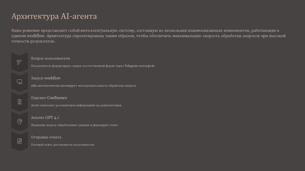 Архитектура AI-агентаНаше решение представляет собой интеллектуальную систему, состоящую из нескольких взаимосвязанных компонентов, работающих в