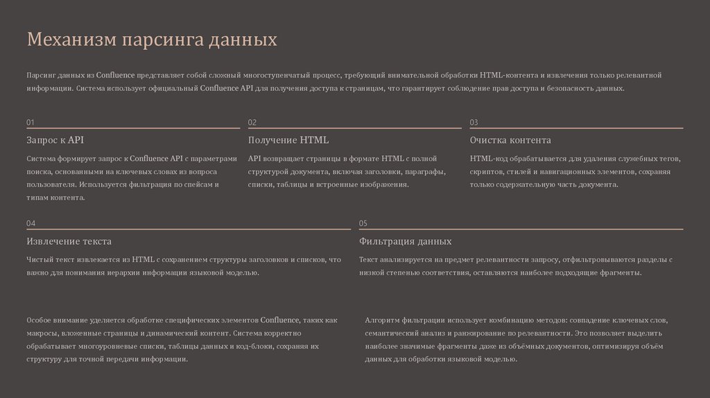 Механизм парсинга данныхПарсинг данных из Confluence представляет собой сложный многоступенчатый процесс, требующий внимательной обработки HTML-контента и извлечения только релевантной