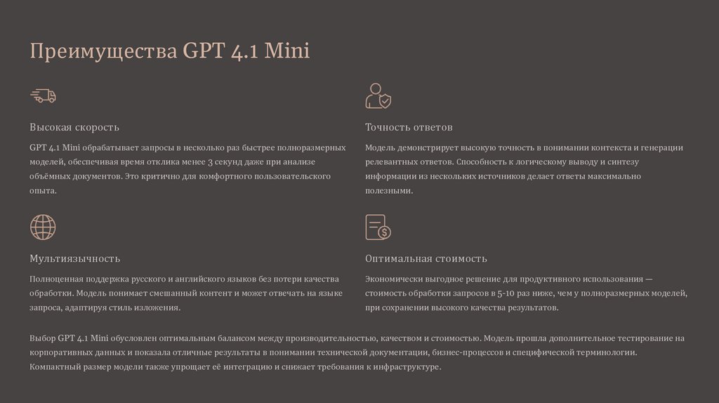 Выбор GPT 4.1 Mini обусловлен оптимальным балансом между производительностью, качеством и стоимостью. Модель прошла дополнительное тестирование на