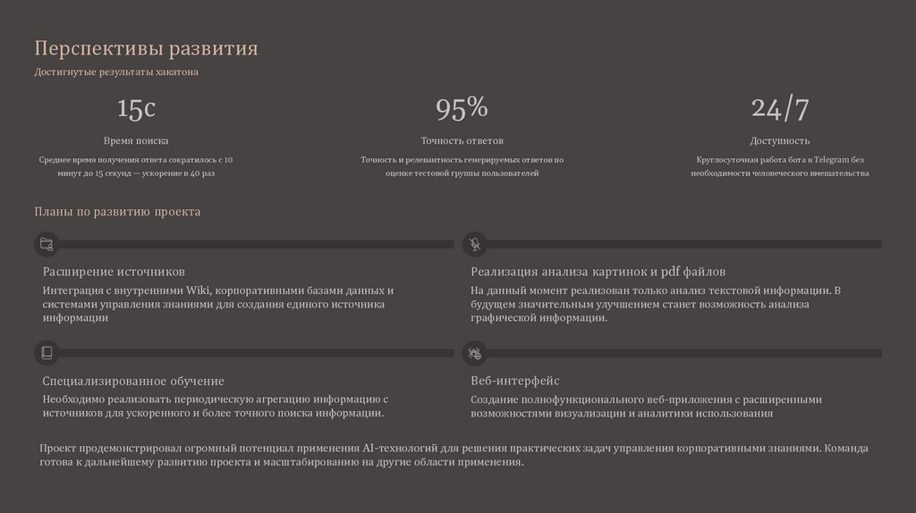 Проект продемонстрировал огромный потенциал применения AI-технологий для решения практических задач управления корпоративными знаниями. Команда