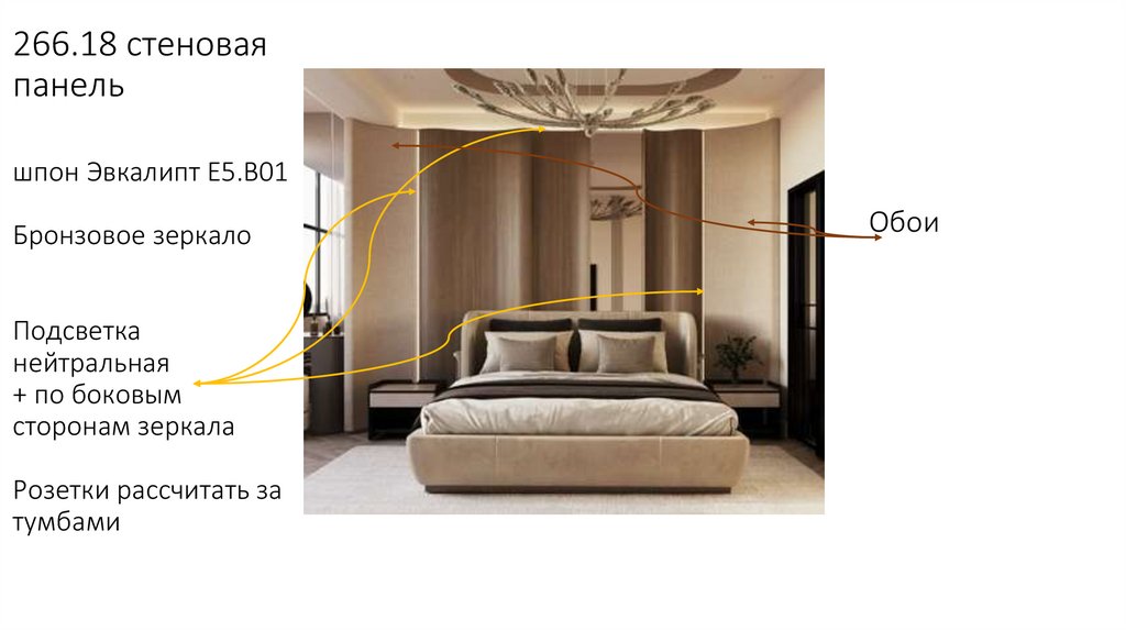 266.18 стеновая панель шпон Эвкалипт E5.B01 Бронзовое зеркало Подсветка нейтральная + по боковым сторонам зеркала Розетки