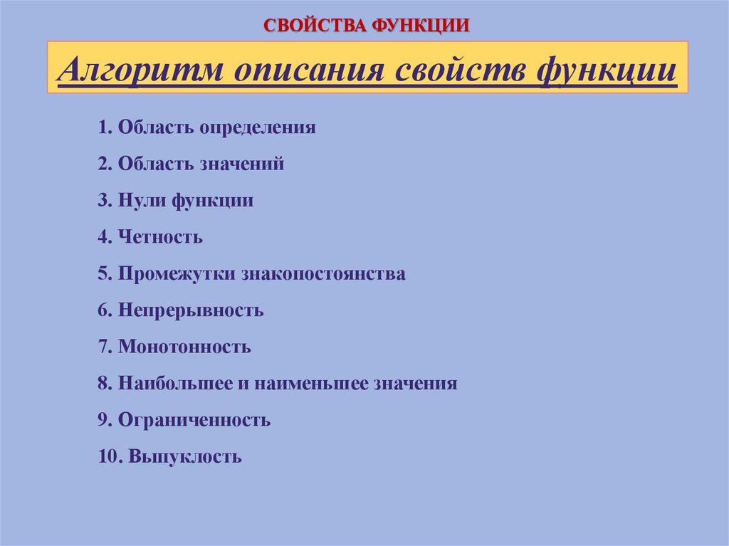 СВОЙСТВА ФУНКЦИИАлгоритм описания свойств функции