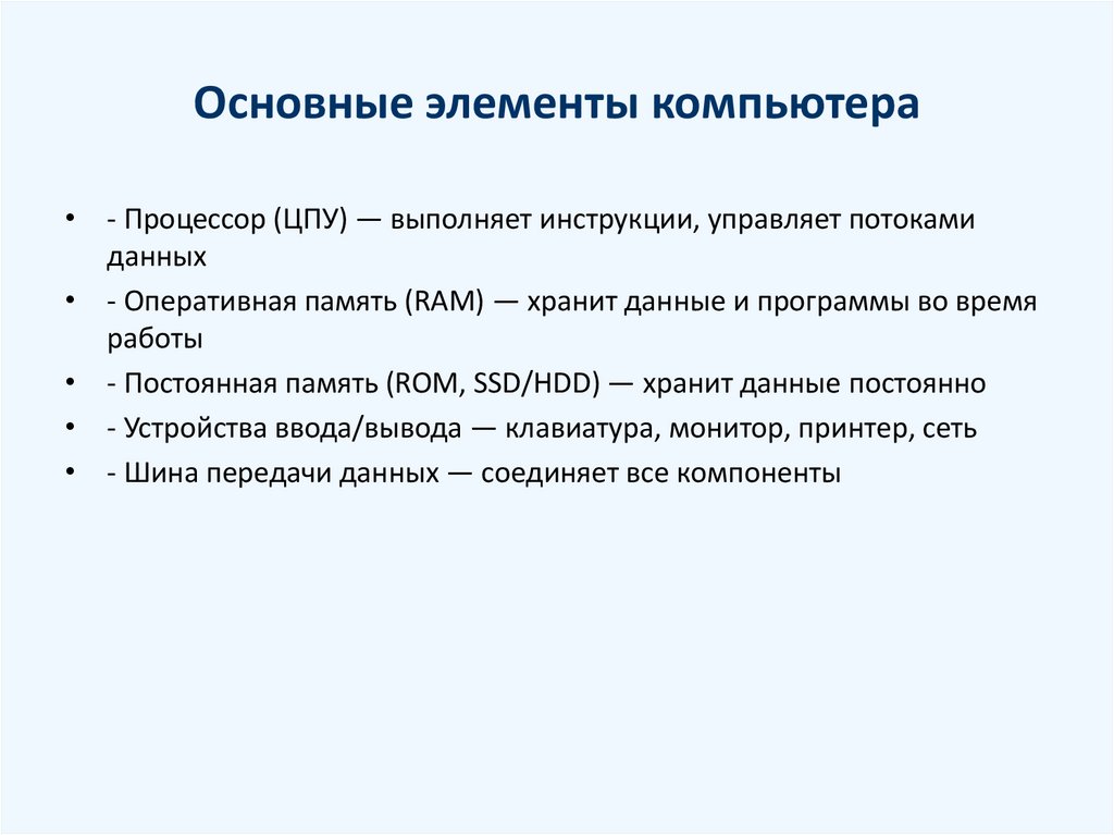 Основные элементы компьютера• - Процессор (ЦПУ) — выполняет инструкции, управляет потоками