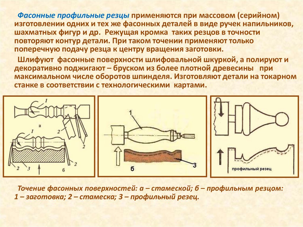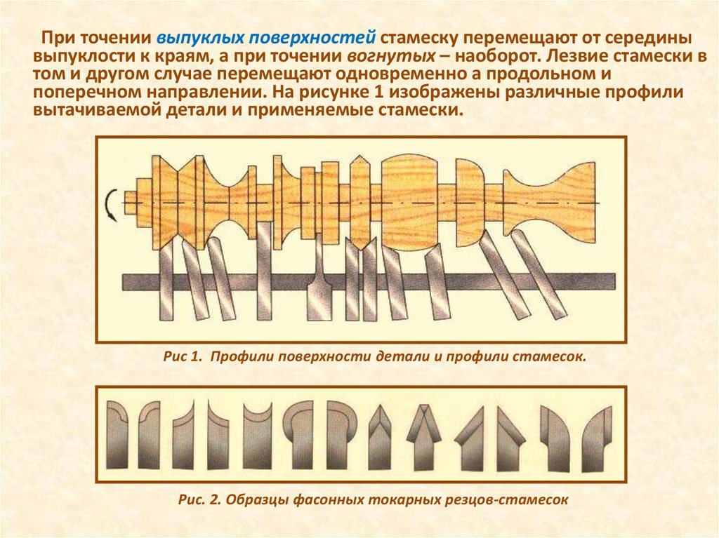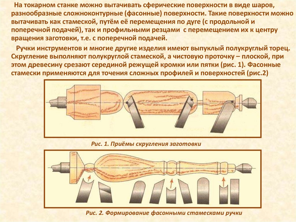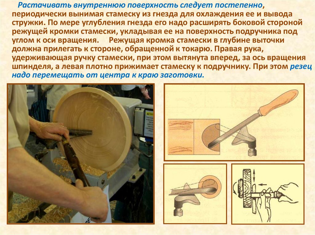 твёрдой древесины плотно прижимают ребром к вращающейся детали, от