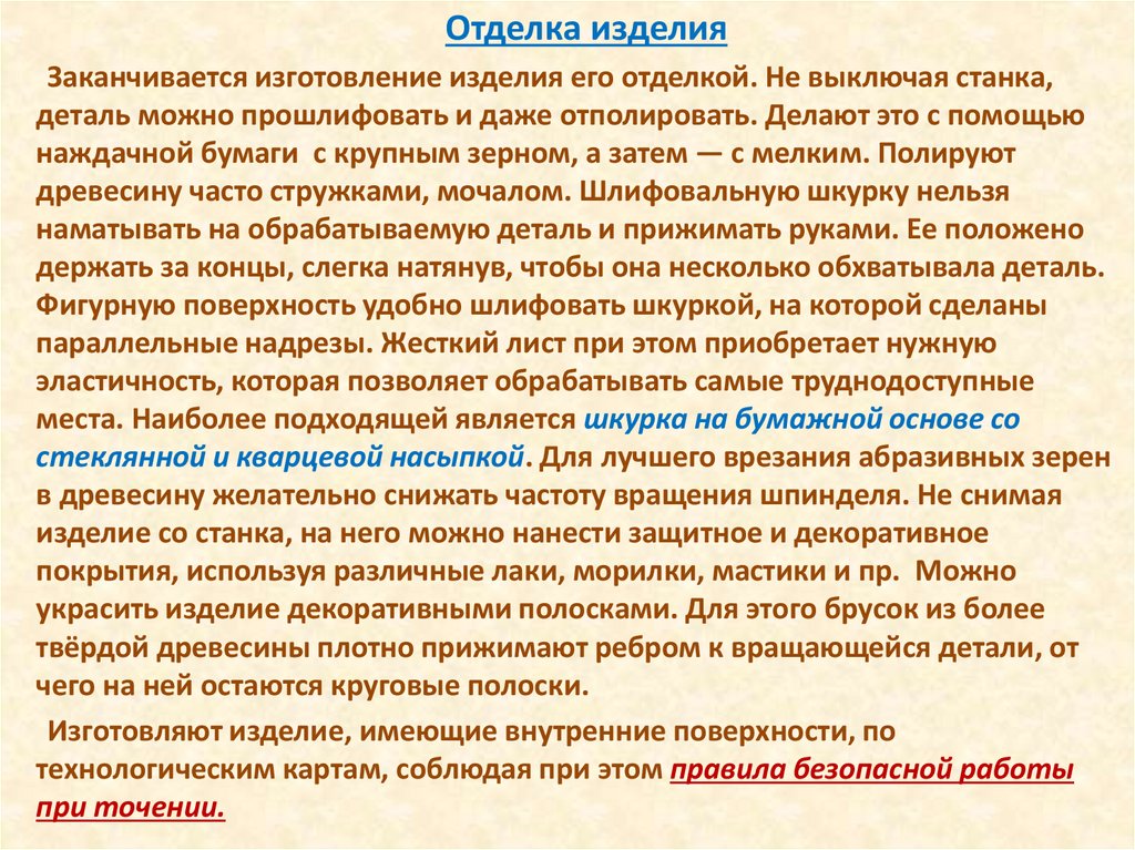 Отделка изделияЗаканчивается изготовление изделия его отделкой. Не выключая станка,