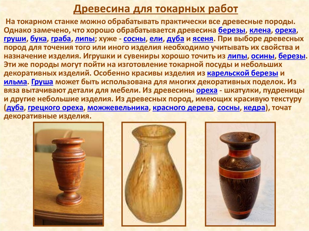 Эти же породы могут пойти на изготовление токарной посуды и небольших
