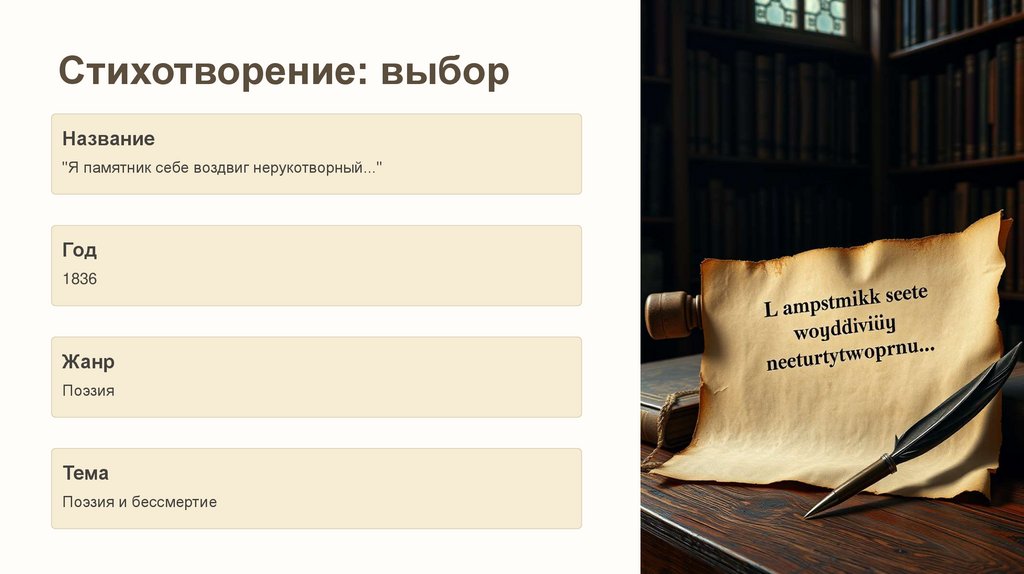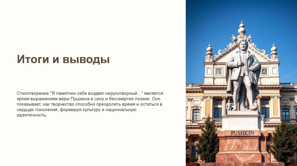 Итоги и выводыСтихотворение "Я памятник себе воздвиг нерукотворный..." является