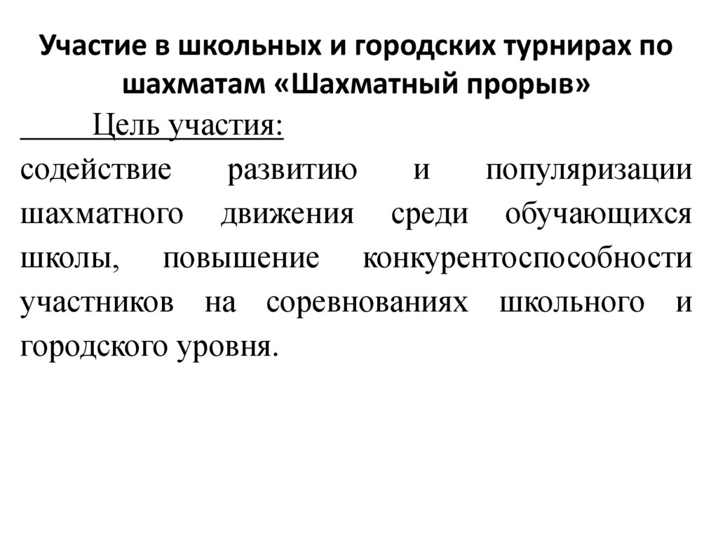 Участие в школьных и городских турнирах пошахматам «Шахматный прорыв»