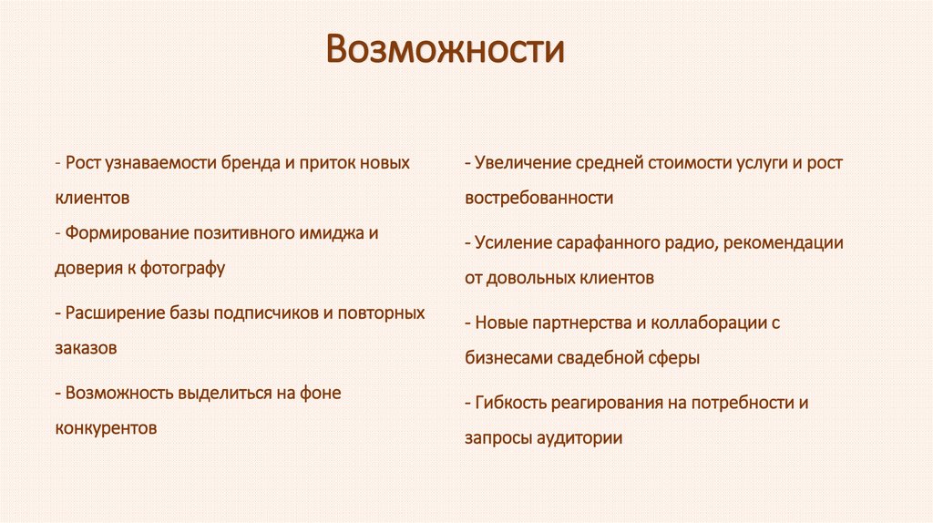 Возможности- Рост узнаваемости бренда и приток новых
