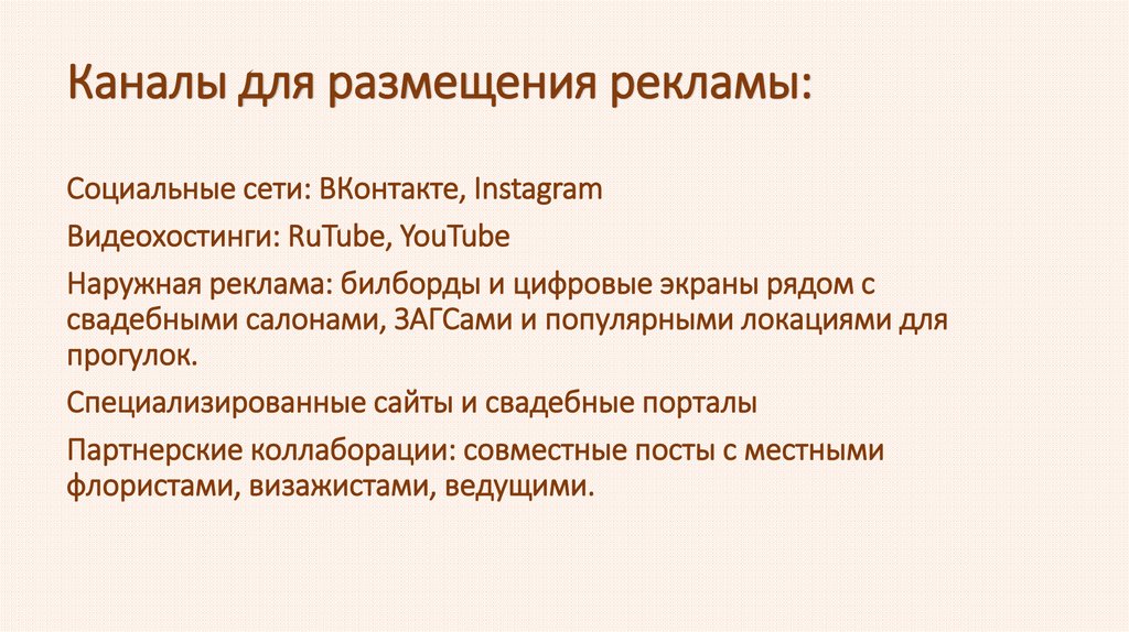 Каналы для размещения рекламы:Социальные сети: ВКонтакте, Instagram