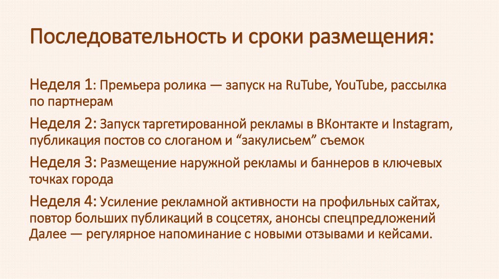 Последовательность и сроки размещения:Неделя 1: Премьера ролика — запуск на RuTube, YouTube, рассылка