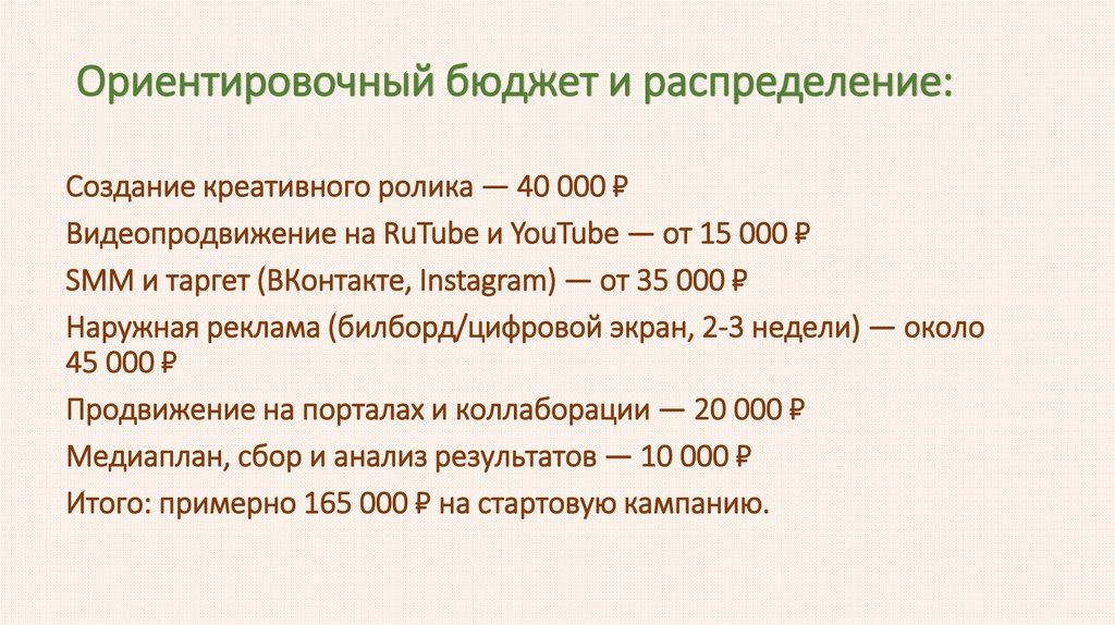 Ориентировочный бюджет и распределение:Создание креативного ролика — 40 000 ₽