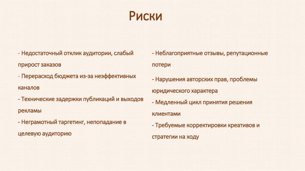 Риски- Недостаточный отклик аудитории, слабый
