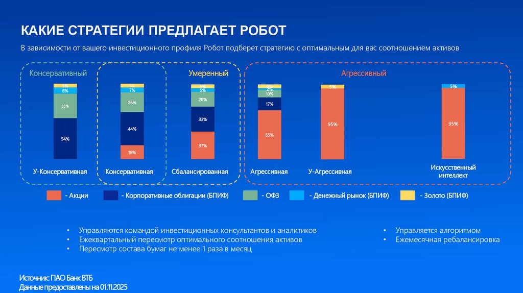 КАКИЕ СТРАТЕГИИ ПРЕДЛАГАЕТ РОБОТВ зависимости от вашего инвестиционного профиля Робот подберет стратегию с оптимальным для вас соотношением активов