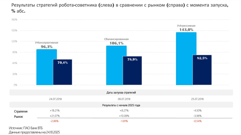 Результаты стратегий робота-советника (слева) в сравнении с рынком (справа) с момента запуска,% абс.