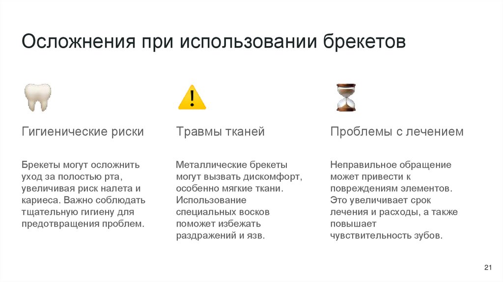 ПроблемаНедостаток информации о брекет-системах и уходе за ними, что может привести к неправильному
