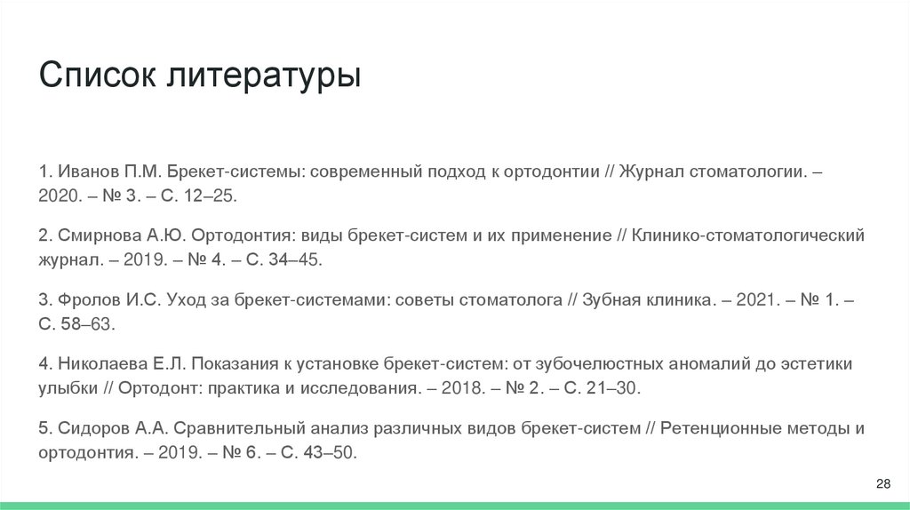 Список литературы1. Иванов П.М. Брекет-системы: современный подход к ортодонтии // Журнал стоматологии. –