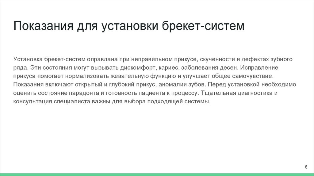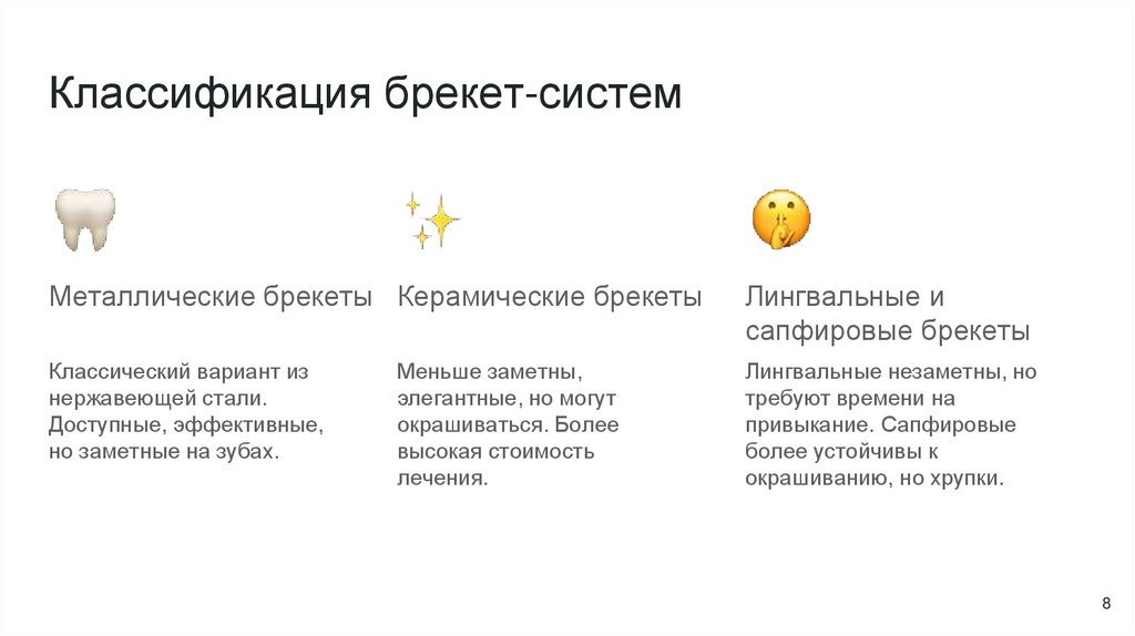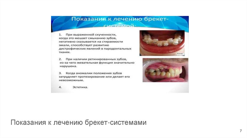 освещает показания для установки, классификацию видов брекетов, уход за ними и возможные