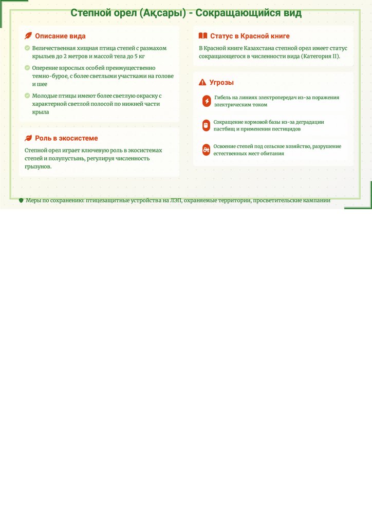 Меры по сохранению: птицезащитные устройства на ЛЭП, охраняемые территории, просветительские кампании
