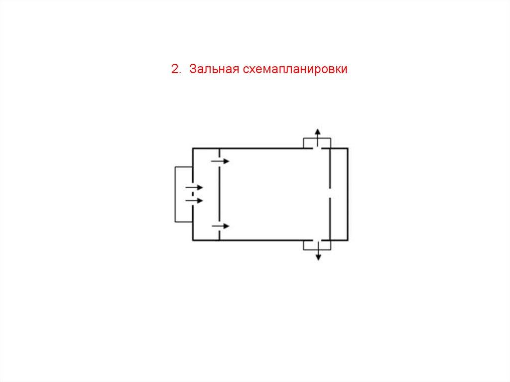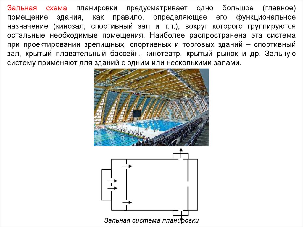 Зальная схема планировки предусматривает одно большое (главное)помещение здания, как правило, определяющее его функциональное