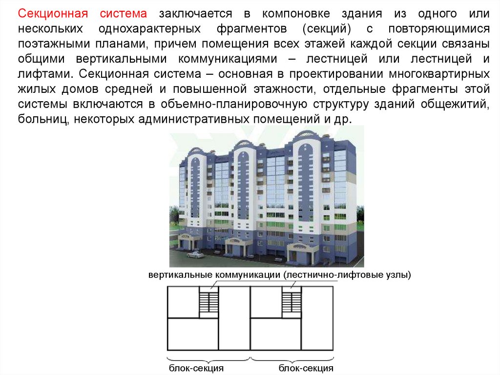 Секционная система заключается в компоновке здания из одного илинескольких однохарактерных фрагментов (секций) с повторяющимися