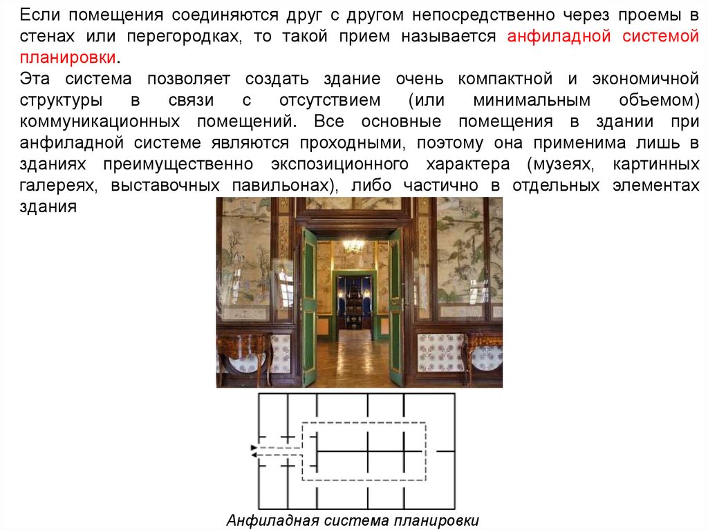 Если помещения соединяются друг с другом непосредственно через проемы встенах или перегородках, то такой прием называется анфиладной системой