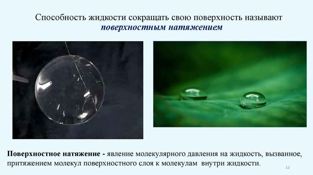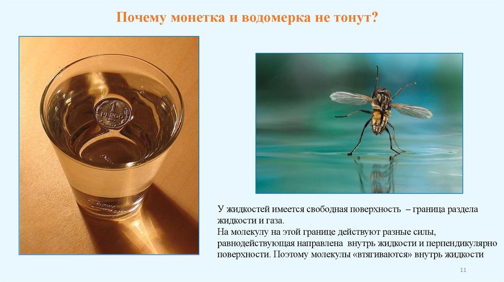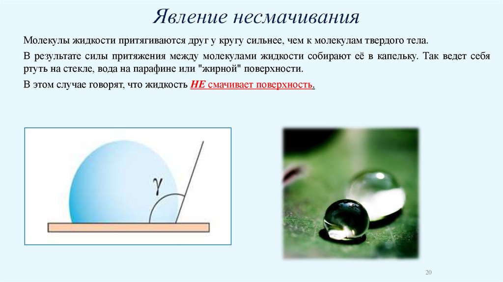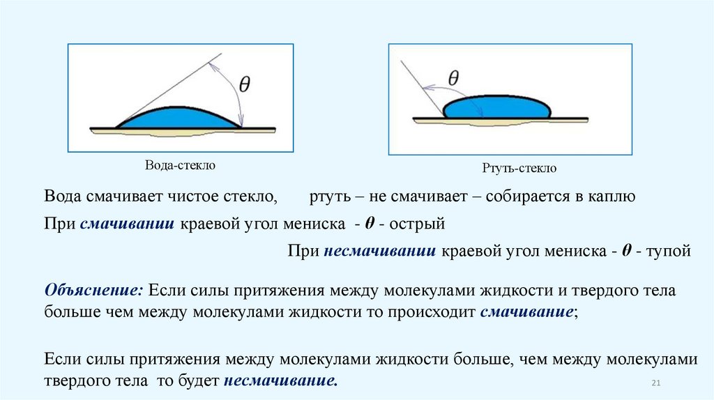 Молекулы жидкости притягиваются друг у кругу слабее, чем к молекулам твердого тела. Врезультате жидкость стремится прижаться к поверхности, расплывается по ней. Так ведет