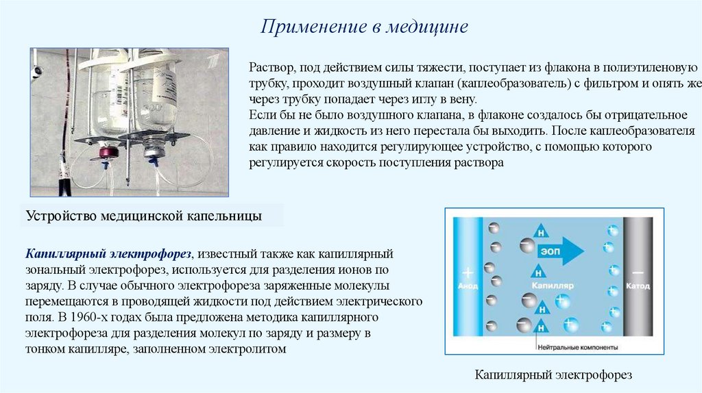 Применение в медицинеРаствор, под действием силы тяжести, поступает из флакона в полиэтиленовую