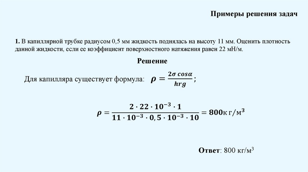 Примеры решения задач1. В капиллярной трубке радиусом 0,5 мм жидкость поднялась на высоту 11 мм. Оценить плотность