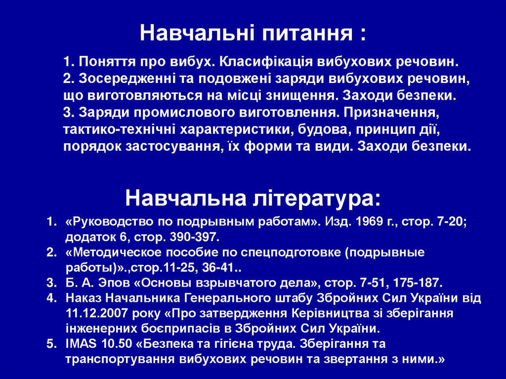 3. Б. А. Эпов «Основы взрывчатого дела», стор. 7-51, 175-187.