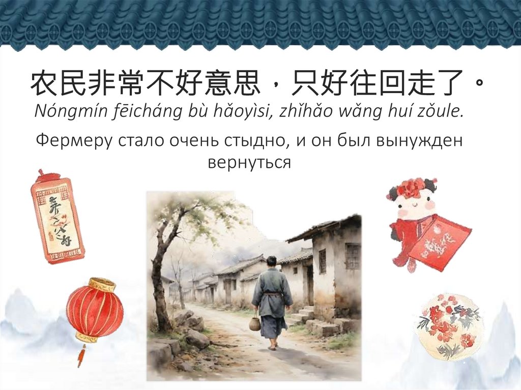 农民非常不好意思 只好往回走了。Nóngmín fēicháng bù hǎoyìsi, zhǐhǎo wǎng huí zǒule.