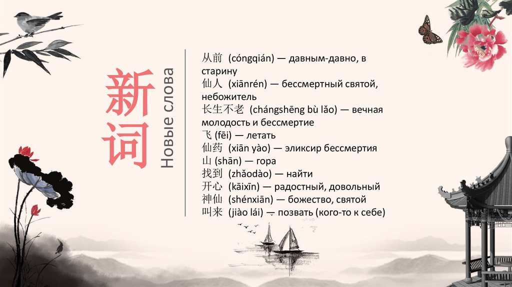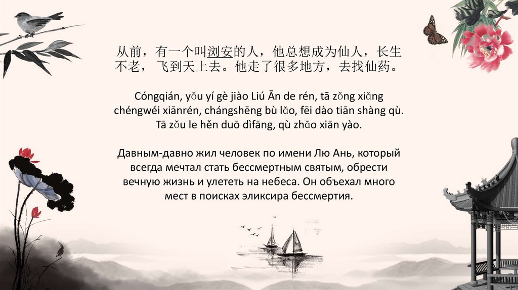 从前 有一个叫浏安的人 他总想成为仙人 长生不老 飞到天上去。他走了很多地方 去找仙药。