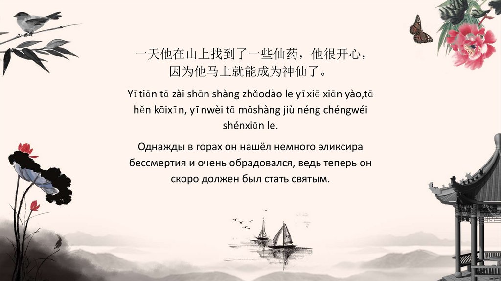 一天他在山上找到了一些仙药 他很开心因为他马上就能成为神仙了。