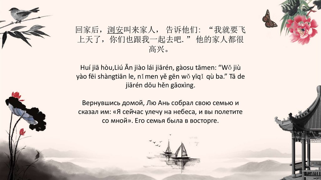 回家后 浏安叫来家人 告诉他们: “我就要飞上天了 你们也跟我一起去吧.” 他的家人都很