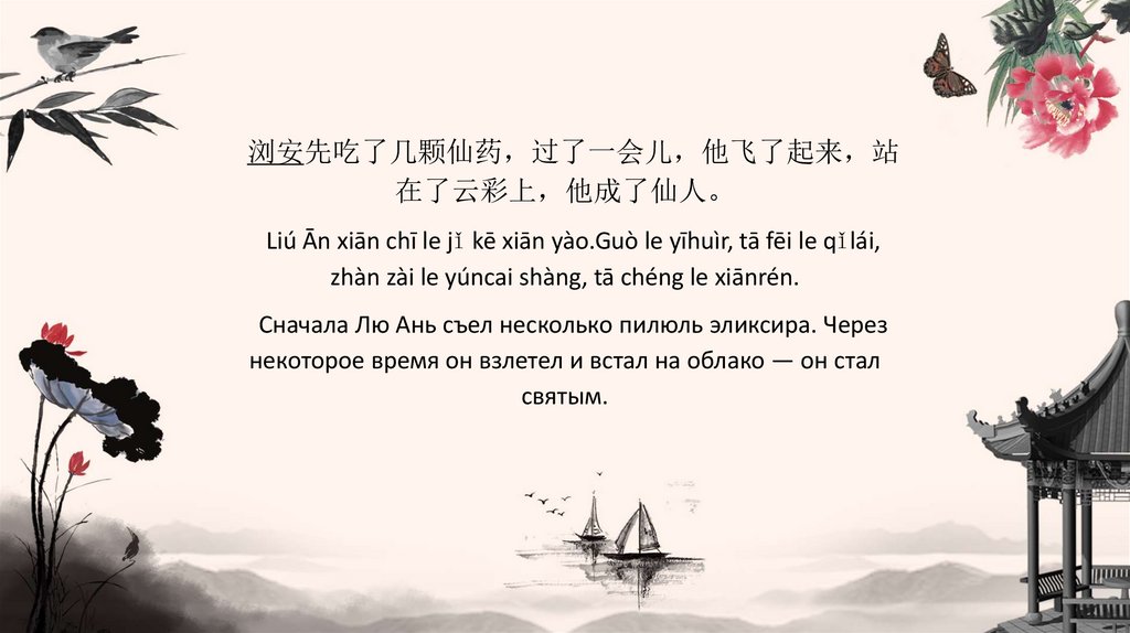 Liú Ān xiān chī le jǐ kē xiān yào.Guò le yīhuìr, tā fēi le qǐlái,