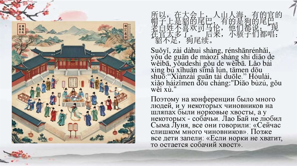当时 做官的人都戴着帽子 帽子上有貂的尾巴。可是因为太多人当官需要很多貂的尾巴 而貂是一种很少有的动物。貂的尾巴用完了 只好用