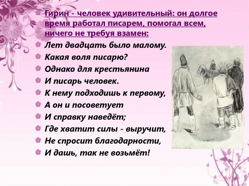 Гирин - человек удивительный: он долгоевремя работал писарем, помогал всем,