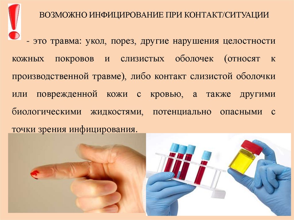 ВОЗМОЖНО ИНФИЦИРОВАНИЕ ПРИ КОНТАКТ/СИТУАЦИИ- это травма: укол, порез, другие нарушения целостности