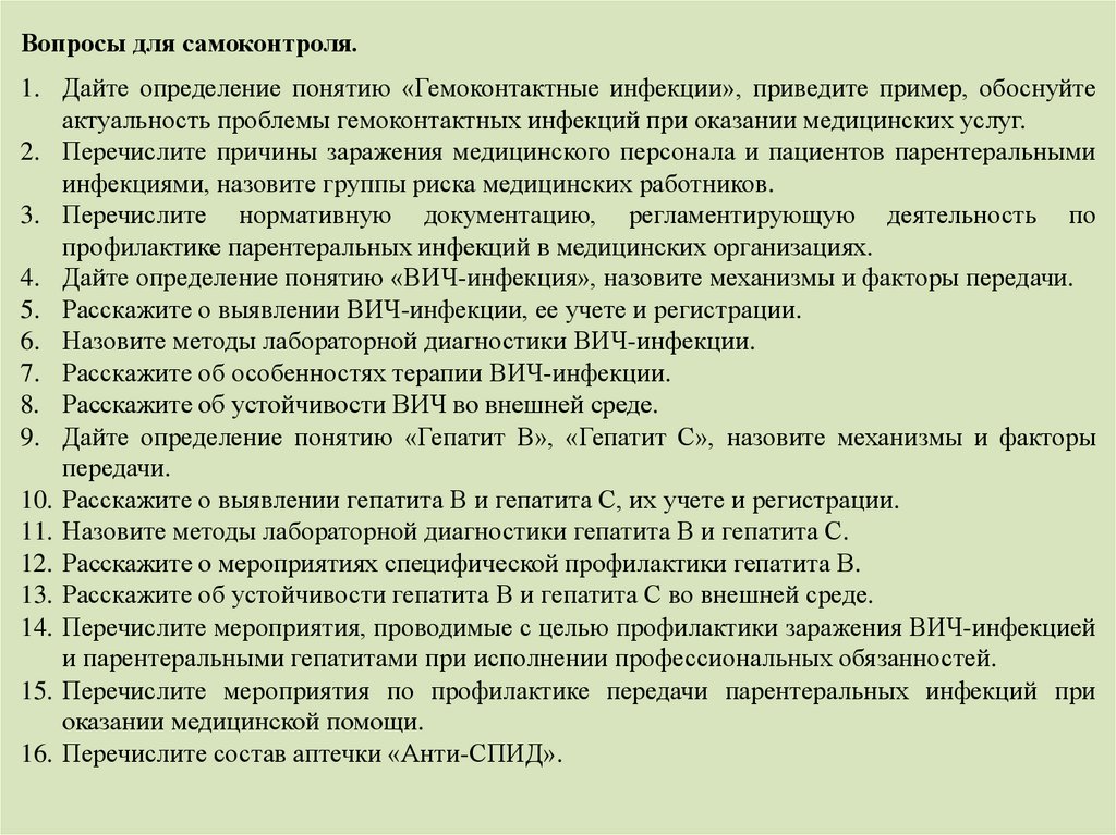 Вопросы для самоконтроля.1. Дайте определение понятию «Гемоконтактные инфекции», приведите пример, обоснуйте