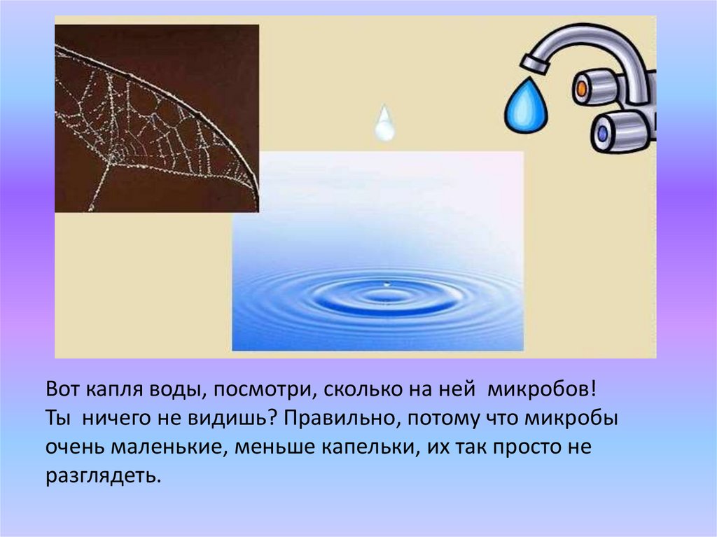 Вот капля воды, посмотри, сколько на ней микробов!Ты ничего не видишь? Правильно, потому что микробы