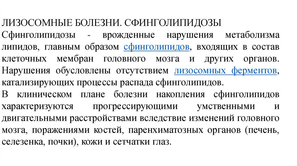 ЛИЗОСОМНЫЕ БОЛЕЗНИ. СФИНГОЛИПИДОЗЫСфинголипидозы - врожденные нарушения метаболизма