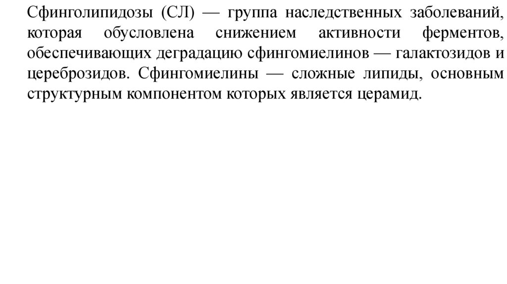 Сфинголипидозы (СЛ) — группа наследственных заболеваний,которая обусловлена снижением активности ферментов,