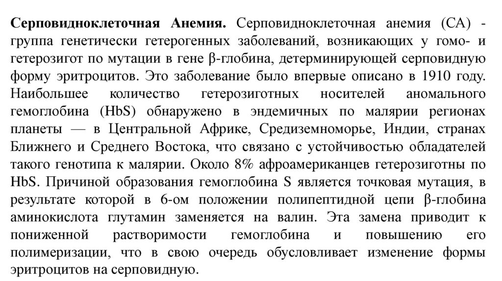 Серповидноклеточная Анемия. Серповидноклеточная анемия (СА) группа генетически гетерогенных заболеваний, возникающих у гомо- игетерозигот по мутации в гене β-глобина, детерминирующей серповидную