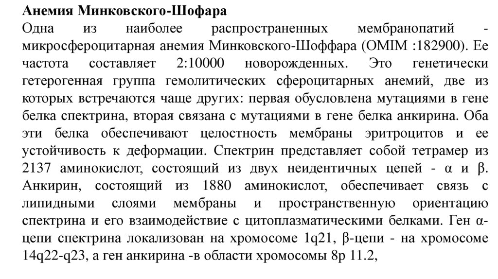 микросфероцитарная анемия Минковского-Шоффара (ОМIМ :182900). Ее