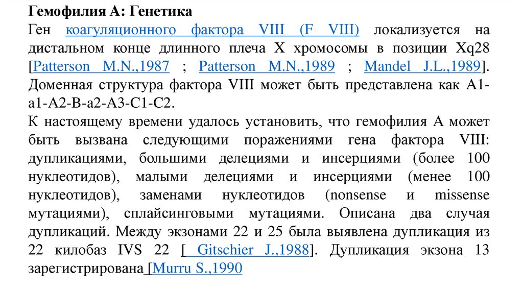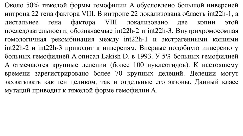 Около 50% тяжелой формы гемофилии A обусловлено большой инверсиейинтрона 22 гена фактора VIII. В интроне 22 локализована область int22h-1, а