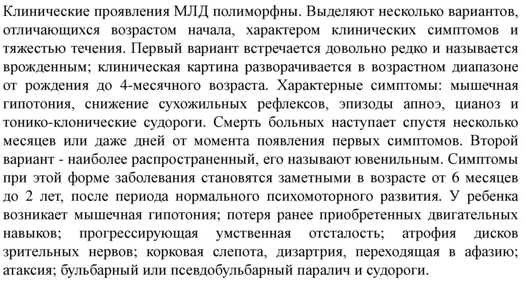 Клинические проявления МЛД полиморфны. Выделяют несколько вариантов,отличающихся возрастом начала, характером клинических симптомов и