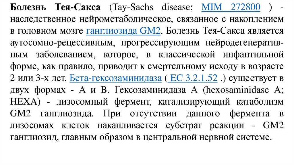 Болезнь Тея-Сакса (Tay-Sachs disease; MIM 272800 ) наследственное нейрометаболическое, связанное с накоплениемв головном мозге ганглиозида GM2. Болезнь Тея-Сакса является