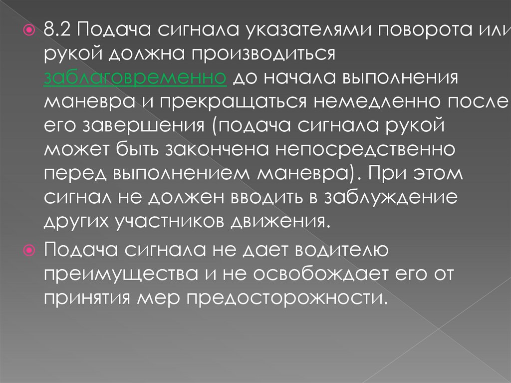 8.2 Подача сигнала указателями поворота илирукой должна производиться
