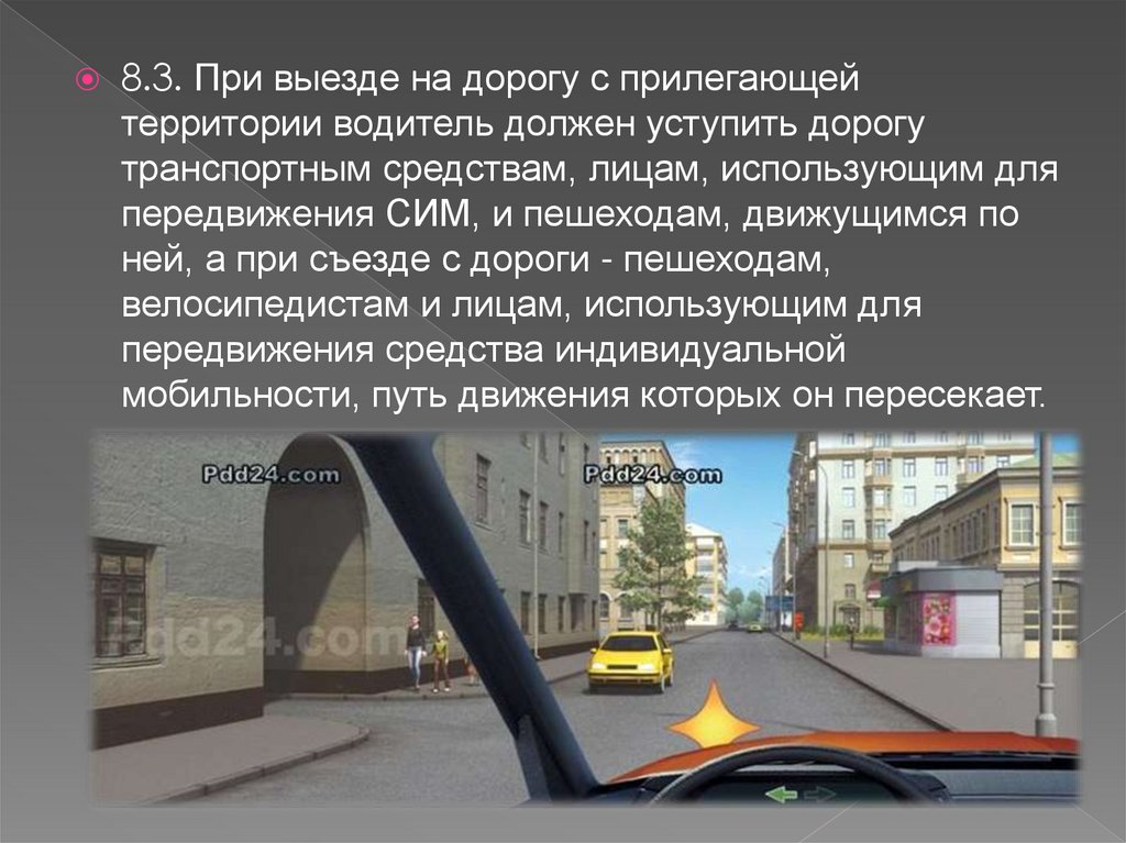 8.3. При выезде на дорогу с прилегающейтерритории водитель должен уступить дорогу